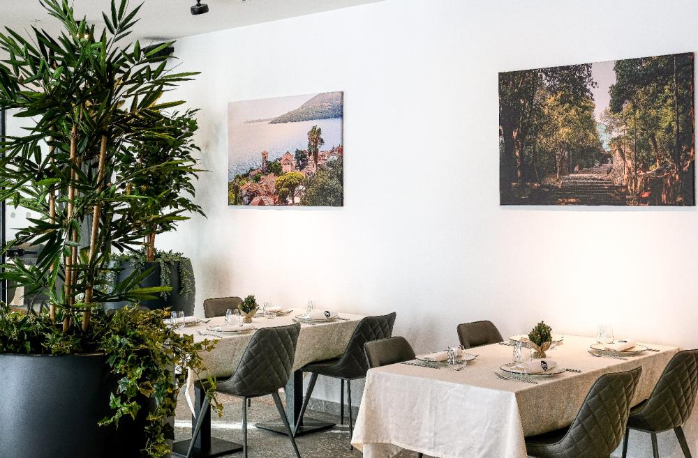 Posebnu čar daje rasvjeta, osmišljena tako da se ambijent mijenja tokom dana — od svijetlog i prozračnog dnevnog ugođaja do toplog, prigušenog večernjeg tona koji prostor pretvara u prijatan lounge ambijent. Zidovi dodatno pričaju priču mjesta, sa oslikanim motivima Herceg Novog i iluzijama pogleda iza škura, dajući enterijeru mediteranski duh u savremenoj interpretaciji.