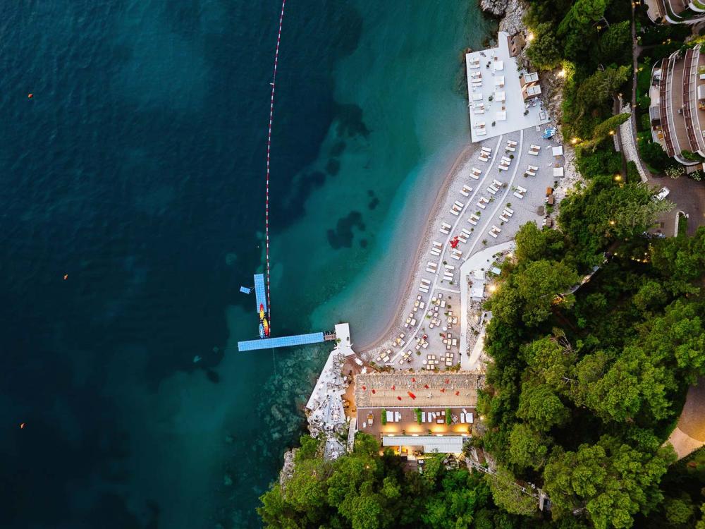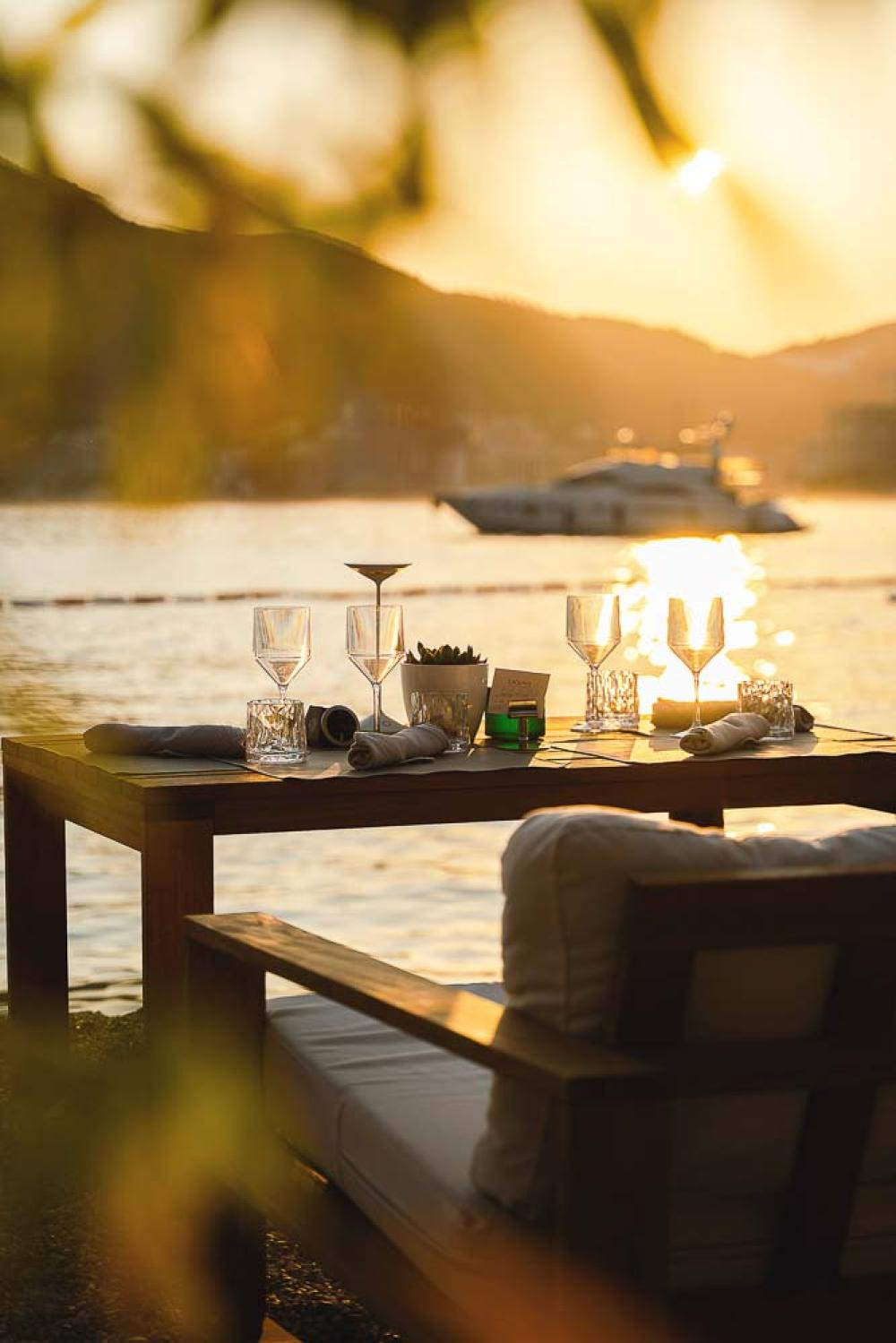 Na samoj obali smješten je prozračni restoran čiji je meni nadahnut svježinom Mediterana. Svakodnevni svježi ulov predstavljen je u “svježem marketu”, dok delicije iz mora gosti mogu birati direktno iz bogatog akvarijuma. Pažljivo pripremljeni specijaliteti i bogata vinska karta sa biranim etiketama sa svih strana svijeta stvaraju gastronomsko iskustvo koje budi sva čula.
