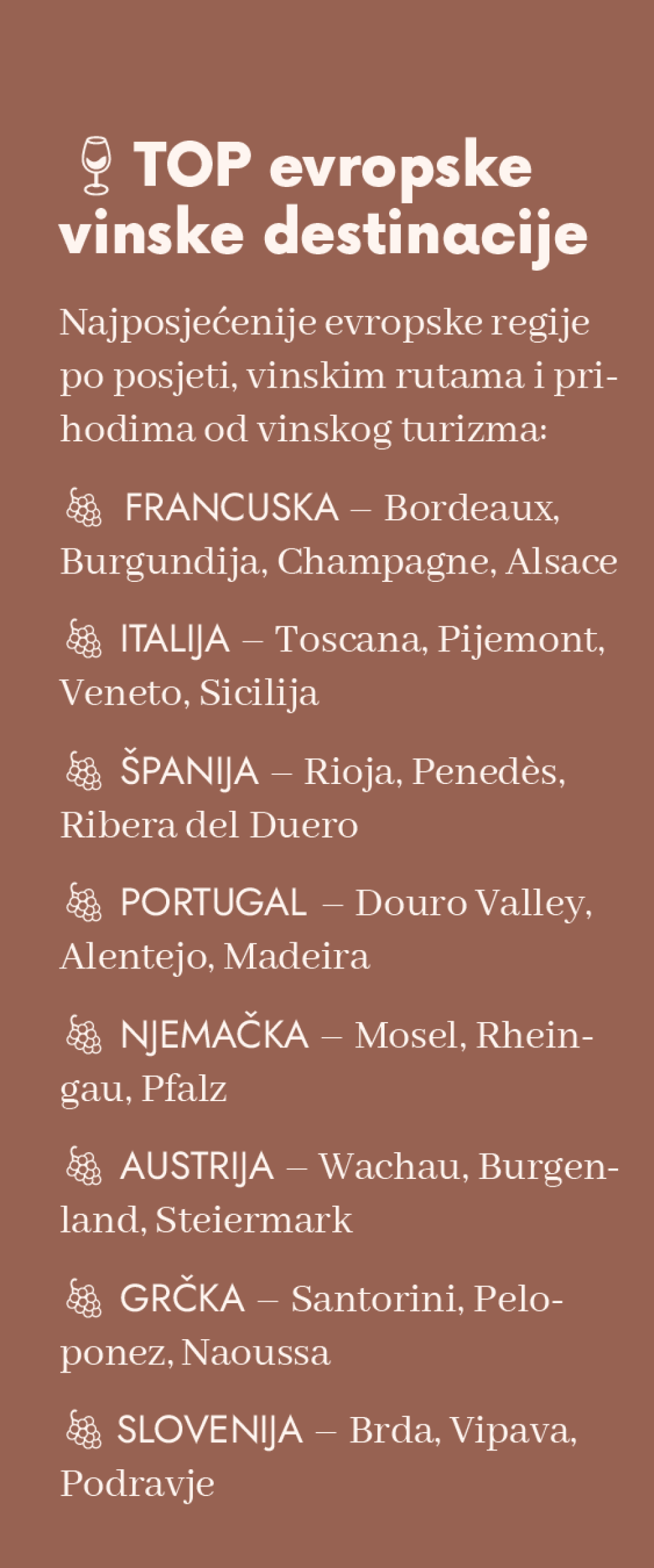 Ovi krajevi u jesen nude više od degustacije – oni nude priču o ukusima, običajima, festivalima vina, o jesenjoj atmosferi kada se vino pije sporije, a razgovori traju duže. Za mnoge putnike, vino postaje razlog da krenu na put baš van glavne turističke sezone, kada krajolici dišu mirnije, a domaćini imaju vremena da ispričaju priče koje nijesu u prospektima.