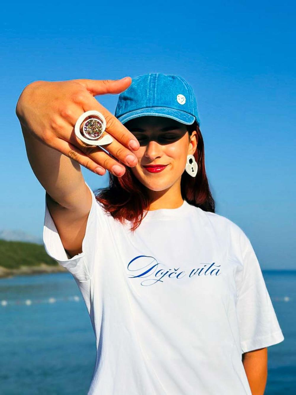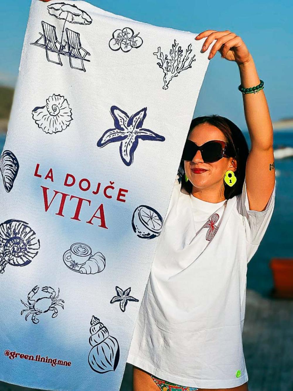 Green Lining se ne zaustavlja samo na modnim detaljima. Brend je nedavno lansirao lifestyle kolekciju „Dojče vita“ – peškire, majice i kape sa ilustracijama inspirisanim crnogorskom kulturom odmora. „To je naš omaž mediteranskom načinu života – sporijem, uživačkom, ali i svjesnijem“, kaže Aleksandra.