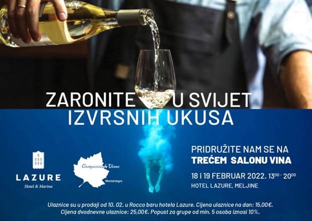 Poseban vinski meni pripremljen je za Vinsko veče 19.02. 2022. , a o rezervacijama i kartama za salon možete se informisati putem email-a: events@lazure.me.