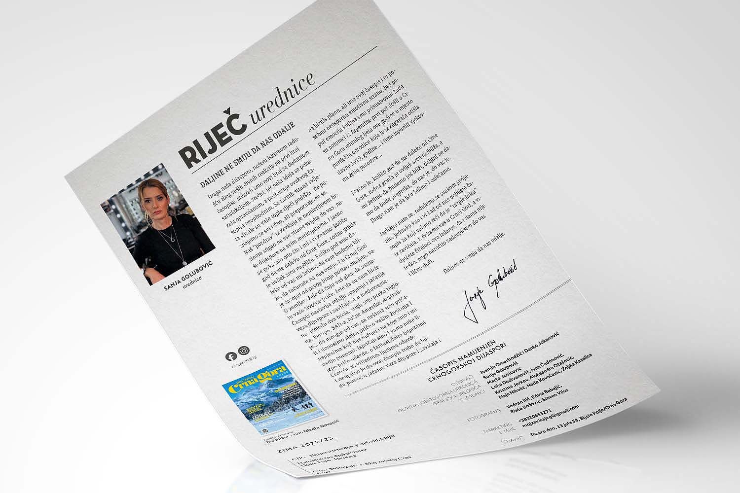 Draga naša dijasporo, nošeni iskrenom radošću zbog vaših divnih reakcija na prvi broj časopisa, stvarali smo novi broj sa dodatnom satisfakcijom, srećni, jer naša ideja se pokazala opravdanom, a postojanje ovakvog časopisa neophodnim. Sa raznih strana svijeta stizale su vaše tople riječi podrške, ne poznajemo se svi lično, ali prepoznajemo se. Naš “pozdrav” iz zavičaja je nemjerljivom brzinom stigao na sve strane svijeta do vas, naše dijaspore na svim meridijanima. I jasno se pokazalo ono što i mi i vi znamo: koliko god da ste daleko od Crne Gore, rodna gruda je uvijek srcu najbliža. Koliko god smo daleko od vas mi želimo da vam budemo bliže, da računate na nas ovdje. I u Crnoj Gori je časopis od prvog broja postao omiljen, vaši zemljaci žele da čuju vaš glas, da saznaju vaše životne priče, žele da su vam bliže. Časopis nastavlja misiju spajanja i jačanja veza dijaspore i zavičaja, a u međuvremenu, između dva broja, stigli smo preko regiona, Evrope, SAD-a, Južne Amerike, Australije… do mnogih od vas, sa nekima smo pričali i donosimo sjajne priče o vašim životima i uspjesima koji nas raduju i na koje smo i mi ovdje ponosni. Ispričali smo i vama neke lijepe priče odavde, o fantastičnim ljepotama Crne Gore, vrijednim ljudima odavde.