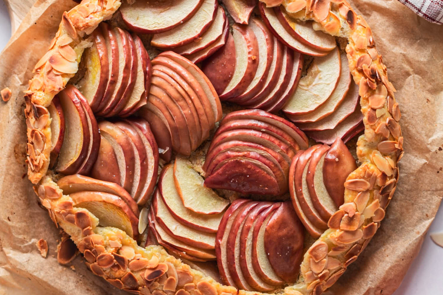 - Zagrijte pećnicu na 185 stepeni. Izvadite tijesto iz zamrzivača i razvaljajte ga u krug dimenzija 30 cm, i prebacite na pleh obložen papirom za pečenje. Premažite tijesto franžipan nadjevom ostavljajući 2 cm nepremazanog ruba. Po nadjevu rasporedite jabuke i preklopite rubove.
