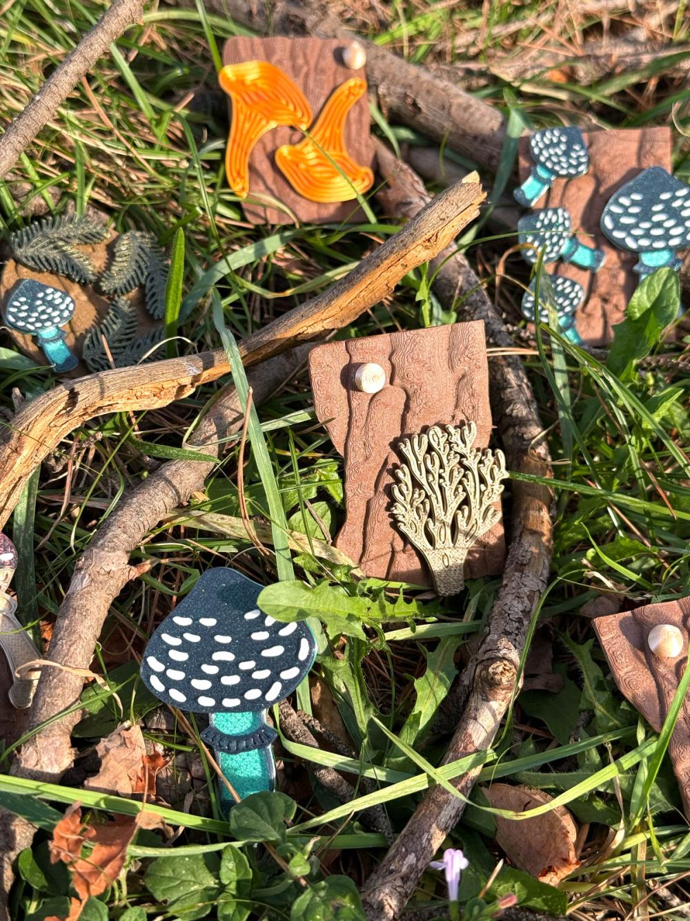 „Gljive Crne Gore“ – šumska estetika i edukacija Krajem ljeta, kad cvjetovi zamiru, nastaje jesenja priča o gljivama—istovremeno estetska i edukativna. Predstavljeno je sedam upečatljivih vrsta: neke zbog forme i boje, druge zbog globalne prepoznatljivosti. Broševi i minđuše dolaze kao pojedinačni motivi ili male kompozicije na podlozi nalik kori drveta (štampanoj filamentom sa ~30% drvene piljevine). Gljive i stilizovane grančice jela izrađene su filamentom sa svilenim ili metalik efektom, zbog čega se komadi nježno presijavaju na suncu—lagani su, uprkos većim dimenzijama. Svaki komad prati razglednica sa originalnim skicama Olge Đurović i nazivima gljiva; na poleđini je prostor za poruku, pa cijela linija funkcioniše kao pažljivo osmišljen poklon.