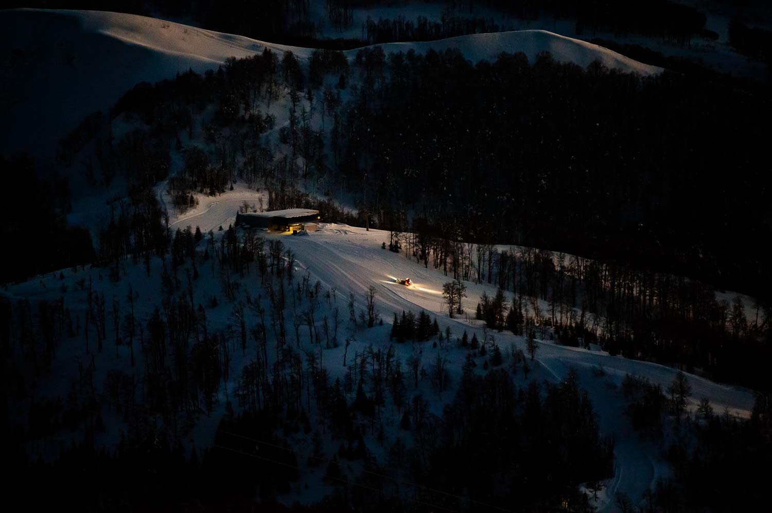 Na početku staze stajala su dva ratraka koji su sa posljednjim zracima sunca kretali u akciju „štampanja staza“ za naredni dan. Naš domaćin Ratko Čogurić, rukovalac tabača snijega na Ski centru Kolašin 1600, poželio nam je dobrodošlicu. Dogovorili smo se da sa njim u kabini budem ja, a da kolegu fotografa Bojana ekipa iz spasilačke službe motornim sankama vozi ispred nas. Zauzeli smo svoja mjesta da bismo iskoristili „zlatni sat“ i magično svjetlo kojom je Bjelasica bila okupana.