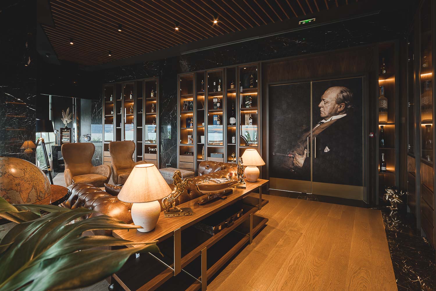 U drugom, manjem dijelu prizemlja, nalazi se privatna, elegantno dekorisana soba sa kaminom i samouslužnim barom. Enterijer ove prostorije ispunjen je luksuznim dekorativnim predmetima iz cijelog svijeta od kojih su neki uistinu jedinstveni - takva je i potpisana sportska memorabilija, u kojoj zaista ima primjeraka vrijednih pažnje. Vrata koja prikazuju majstorski izrađen Čerčilov portret vode iz VIP sobe u zaklonjenu terasu sa kabanama, gdje gosti mogu da uživaju u privatnosti na otvorenom. U ovoj prostoriji gosti takođe mogu naći razne vrste pažljivo odabranih cigareta i tompusa koje mogu spariti sa čašom izvanrednog viskija, i prepustiti se jedinstvenom momentu hedonizma.
