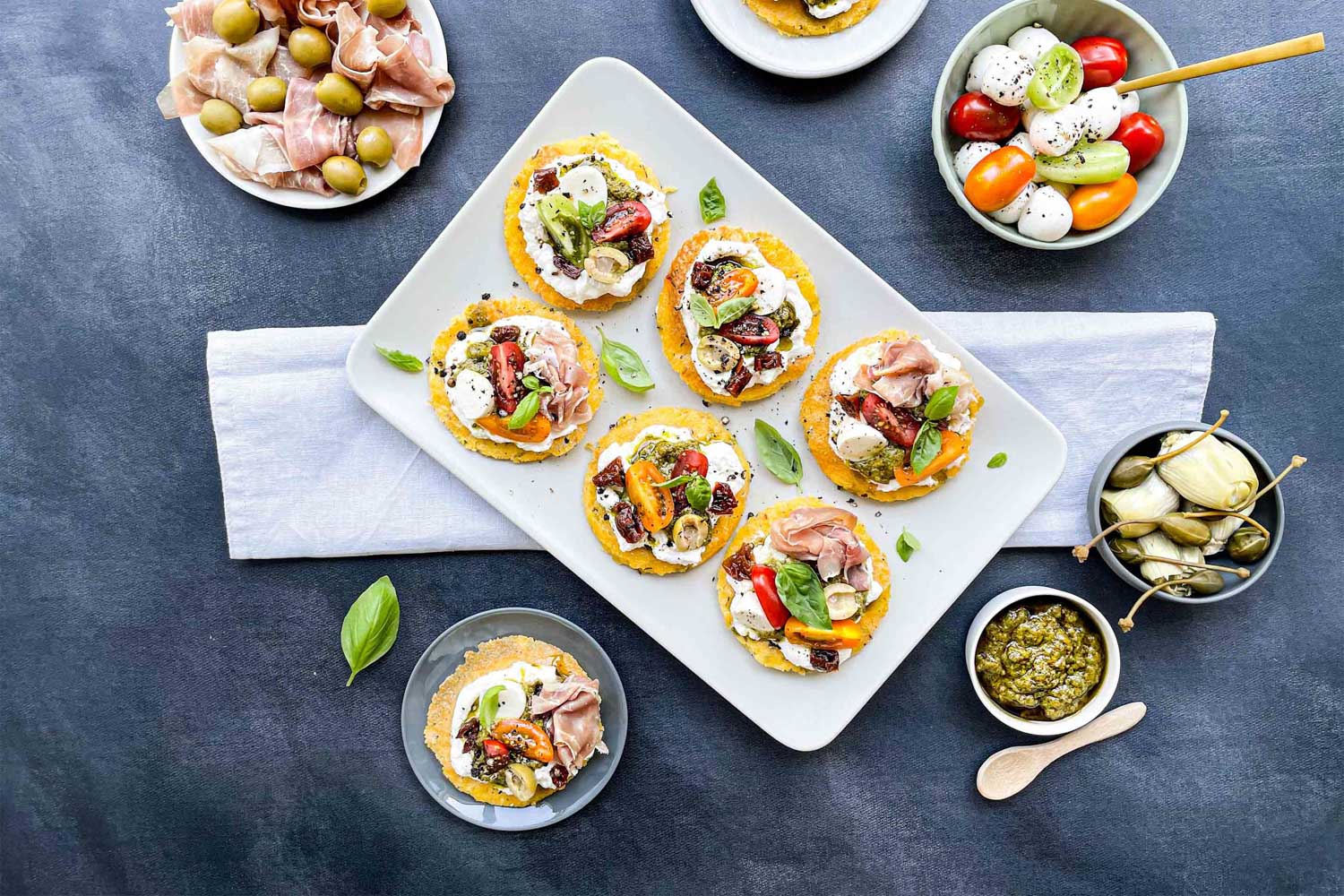 - Sada rasporedite Ricottu i pesto preko brusketa. Na bruskete stavite mocarelu, čeri paradajz i sušene paradajze. Posolite i pobiberite i poprskajte sa malo maslinovog ulja i balzamiko sirćeta. Dodajte malo svježeg bosiljka.