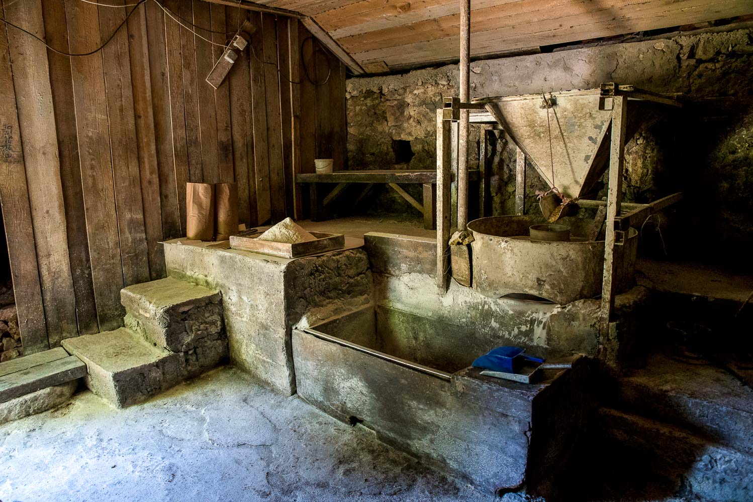 Iz mlina se nalazi jaža u kojoj se skuplja voda koja se cijevima dovodi do ustave koja okreće mlinski kamen. Nekad je ona bila drvena, ali su je Milatovići davno zamijenili sa metalnom. Nju s vremena na vrijeme treba izvaditi da se promijene ležajevi i da se podmaže. Ustave se podiže ili spušta u zavisnosti od toga kojom brzinom želite da se okreće kamen koji melje žito. Brzina mljevenja žita utiče na kvalitet brašna pa se o tome itekako treba voditi računa. Ovaj posao iziskuje znanje i iskustvo. Tako se vlažno žito brže melje, a ono suvlje sporije. U suprotnom mlinski kamen ga sagori i ono dobije gorak ukus. Kukuruzno brašno ne smije da bude presitno kao puder, već mora da zadrži krupnije zrno i prepoznatljivu oštrinu. Dautović nam kaže da je najteži dio redovnog servisa mlina podizanje mlinskog kamena prilikom oštrenja i čišćenja koje mora s vremena na vrijeme da se odradi. Prije su ljudi to radili drvenim i metalnim polugama, što nije bilo nimalo lako jer je vodenički kamen težak skoro pola tone. Danas u mlininu imaju dizalicu pa je ta rabota znatno lakša. No, kamen svakako treba vratiti i centrirati što opet iziskuje znanje i vještinu.